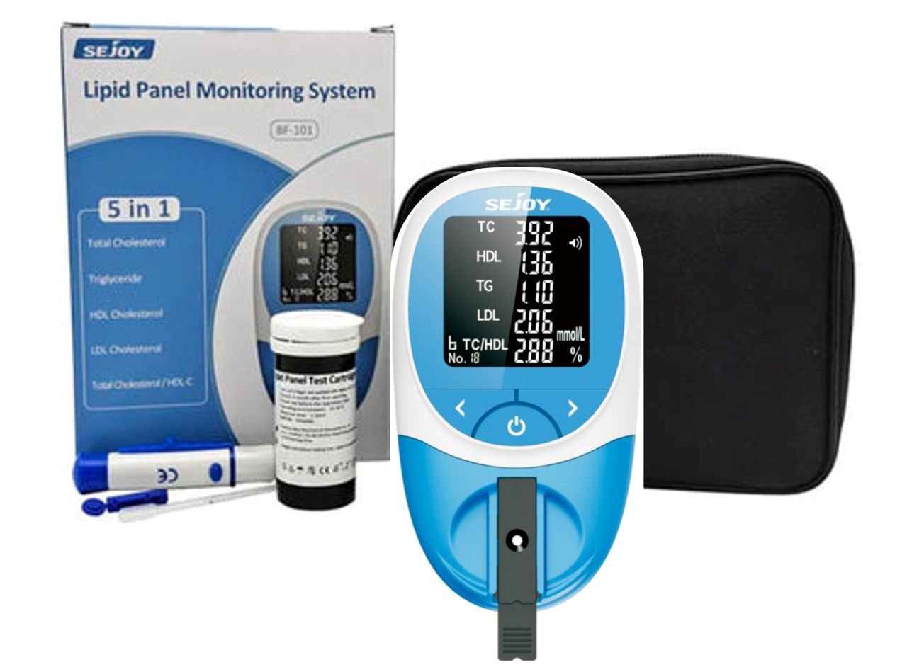 Sejoy Lipid Panel Blood Monitoring System provides a convenient, accurate, and cost-effective method to screen patients for lipid disorders and help manage their treatment. The Sejoy blood lipid meter measures Total Cholesterol (TC), HDL Cholesterol (HDL), Triglyceride (TG), LDL Cholesterol (LDL), and provides calculated Total Cholesterol/HDL Cholesterol. The Sejoy lipid profile analyzer only requires a small amount of blood sample to quickly obtain results within two minutes.